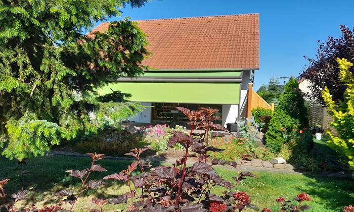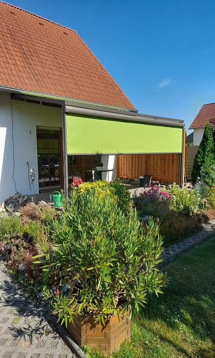 Markisen sind von Haus aus Sonnen- bzw. Blendschutz und müssen bei Regen eingefahren werden. Das Problem dabei ist nicht so sehr das nasse Tuch. Unsere Markisentücher sind mehrfach imprägniert. Bei normalen Markisen kann das Wasser nur schlecht ablaufen und es bildet sich schnell ein Wassersack. Dessen zunehmendes Gewicht kann Tuch bzw. Markisenarme beschädigen. Bei diesem Markisentyp lässt sich in Verbindung mit einer Mindestneigung sowie optional einer absenkbaren Stütze ein unter Aufsicht nutzbarer Regenschutz realisieren