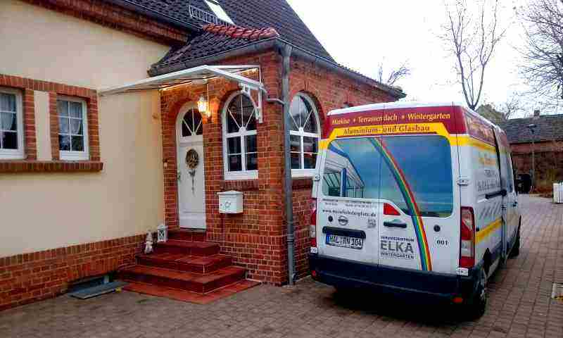 In dieser Seitenansicht lassen sich noch einige Besonderheiten der in Bad Belzig realisierten Vordachvariante erkennen. Dazu gehört auch die in das Wandanschlussprofil integrierte LED-Beleuchtung incl. Trafo und Bewegungsmelder.