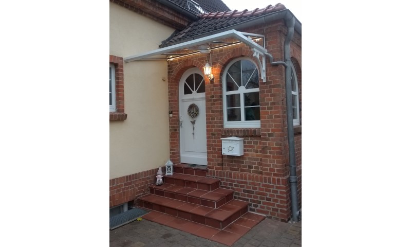 Das Vordach ist mit 5 rostfreien Schrauben SW17 bzw. SW19 im Mauerwerk verankert und fügt sich harmonisch in das Gesamtbild des Anbaues ein. Bei der farblichen Gestaltung der Profile werden heute gern grau- oder antrazitfarbene Pulverbeschichtungen bevorzugt. Hier war weiß die erste Wahl.