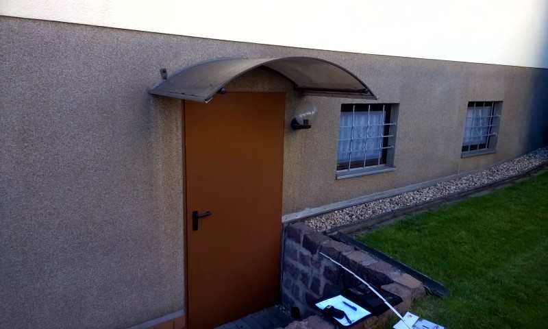 Die folgenden Fotos zeigen das fertige neue Vordach 'Berlin' bei unseren Kunden in Müllerdorf Gem. Salzatal. Die Scheibe besteht übrigens aus zwei vorgespannten, 8mm starken Einzelscheiben, zwischen denen sich eine ca. 1,5mm starke durchsichtige Folie befindet. Diese hält bei Glasbruch die Scheibe zusammen. Die Scheibe ist insgesamt 17,5mm dick und mißt 90x150cm.