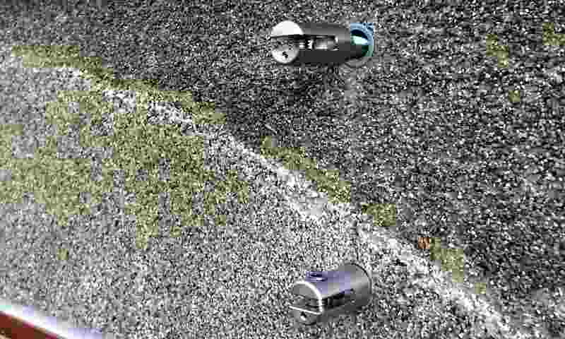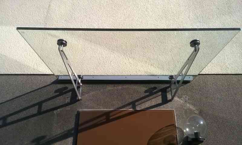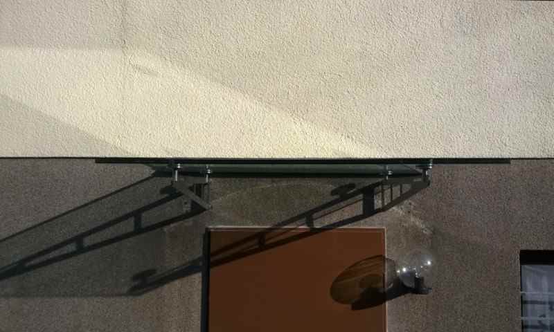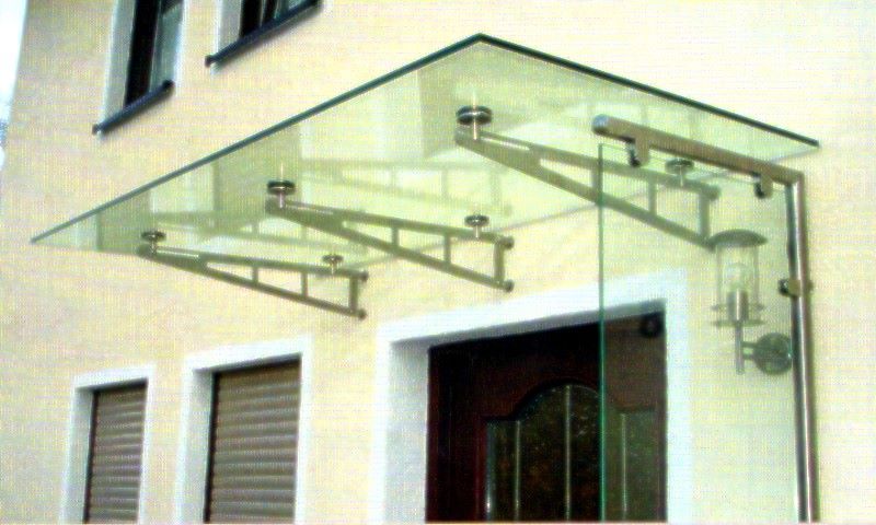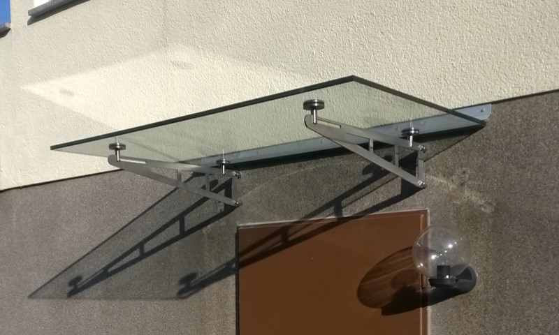 Vier dieser Befestigungspunkte nehmen über zwei Edelstahlkonsolen, sogenannte 'Schwerter, die Eigenlast der Scheibe (immerhin 54 kg) und die Verkehrslasten, vor allem Schnee usw. auf. Die üblichen Kunststoffdübel wären bei einem solchen Vordach fehl am Platze. Und auch gar nicht zugelassen.