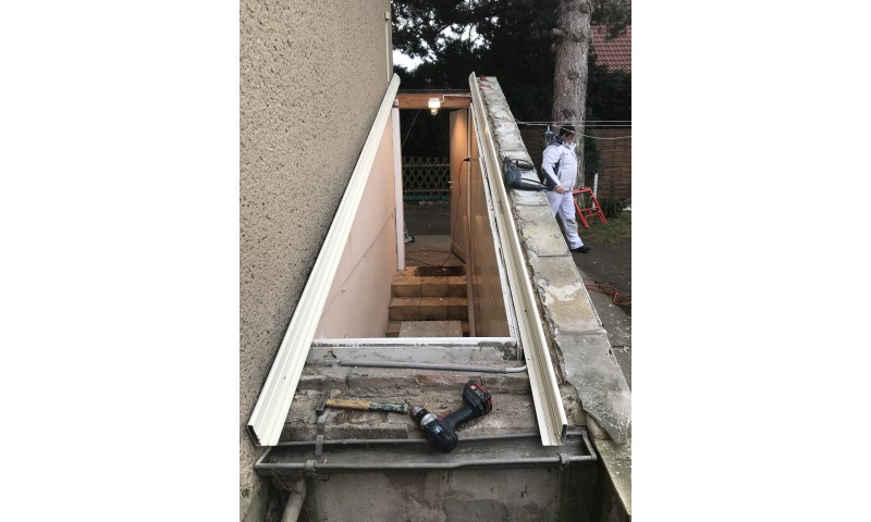 Von der Marke "Eigenbau" hat diese Kellertreppenüberdachung jahrzehnte lang gehalten und getan was sie sollte: Die Kellertreppe vor Regen und Schnee schützen. Zuletzt gab Ihr ein vom Dach gefallener Ziegel den 'Rest'. Unter der provisorischen Abdeckung wartet sie auf Ihre Sanierung.