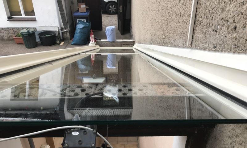 Gut zu erkennen ist hier das verwendete Verbund-Sichertheitsglas und die polierte Glaskante. Darüber wird noch eine Abdeckung montiert damit Nässe nicht zwischen die Glasscheiben ziehen kann.