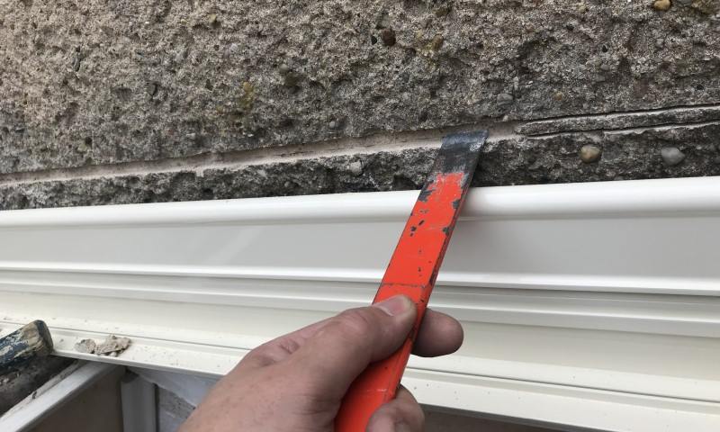 Über dem Wandseitigen Träger wurde der Putz eingeschnitten. Hier wird ein Blech eingeklebt, welches das an der Hauswand herablaufende Regenwasser zuverlässig von der Anschlussfuge weg leitet.